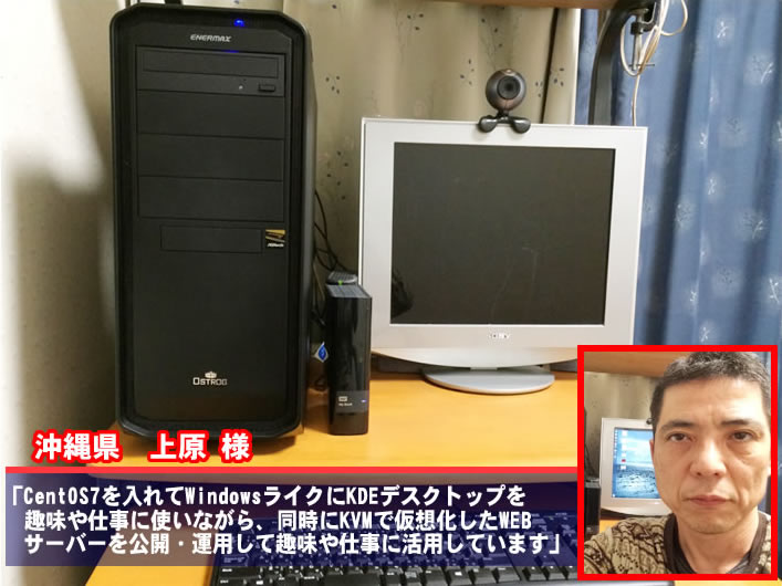 CentOS7を入れてWindowsライクにKDEデスクトップを趣味や仕事に使いながら、同時にKVMで仮想化したWEBサーバーを公開・運用して趣味や仕事に活用しています。