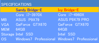 マザーボードがちょっと違うだけであとは同条件である。もっともマザーボードも、スロットの数が異なる程度で、性能に差があるわけではない。IvyBridge-Eは、X79チップセットが使用できる。それ故既存のX79マザーが使用可能である。