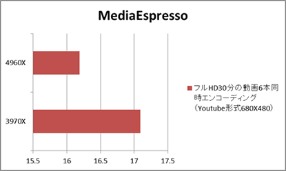 お次はビデオエンコードの性能である。結果として、1秒くらいの差しかついていない。しかしこのテストも、これから購入を考えている方への大きな指標となるだろう。 このテストは30分のフルHD画質のビデオを、Youtubeに最適化した形式にエンコードするものである。しかも6本同時に、である。MediaEspressoCPUコア数の上限まで同時にエンコーディングすることができるのだ。だから6本同時にやってみたわけだが、その6本が16秒台、一本分のビデオの長さの約半分。マルチエンコーディングでなければこの6倍の時間がかかることを考えれば、なかなかにすごいと思う。