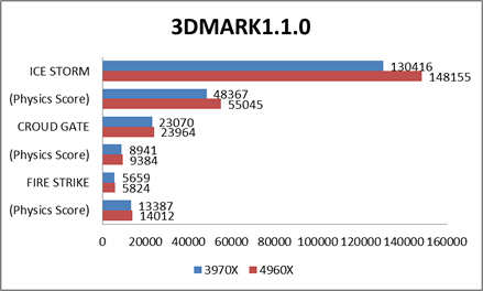 3DMARKはどちらかと言うとゲーミングマシン用のベンチであり、ビデオカードの性能が物を言うが、GPU(ビデオカードのプロセッサ)を全く使わず、CPUのみの測定ができるPhysics Score(物理演算の点数)を併記してみた。いずれのテストでも、4960Xが圧勝!