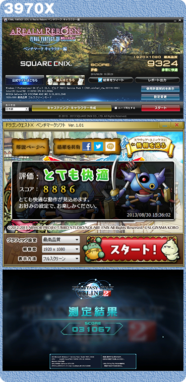 これも当店恒例となった、超人気ゲームのベンチマークである。モードはすべて最高画質、フルHD1980?1080である。一昔前のノートパソコンでも快適に動作するように設計されているドラクエにおいては圧勝して当然であるが、やはり画質を究めんとするファイナルファンタジーでの勝利が大きい。どれも結果は「最高に快適」である。やはりこれも最高のビデオカードと組み合わせてみたいところである。また、メモリはDDR3-1866まで対応しているということで、そちらの組み合わせも非常に興味のあるところである。デスクトップ級王者決定! 新チャンピオン誕生!!