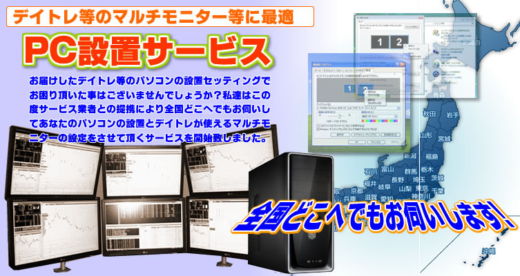 当 店と提携している、全国に拠点を持つ技術サービスマンが、PCをお買い上げいただいたお客様のご自宅にお伺いし、PCのハードウェアのセッティングからソ フトウェアのインストール、そしてデイトレードのマルチモニターの設定等、初心者の方にはハードルの高い作業を代行いたします。