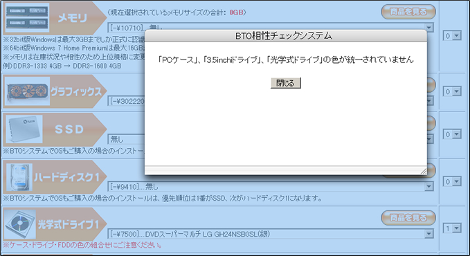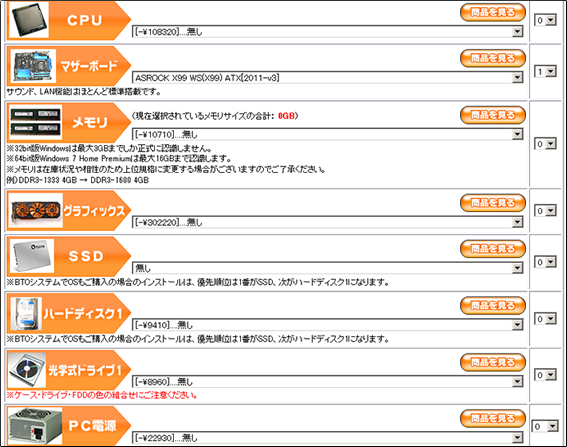 注文画面より マザーとケース以外はすべて「無し」の選択肢があります。