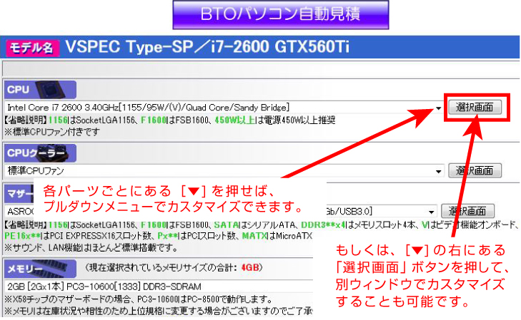 特に他店では見積りの段階で「組み立てた経験が無いため出来ない」と断られたCPUファンやケースの組み合わせがカスタマイズ画面だけで出来たのが嬉しい。
