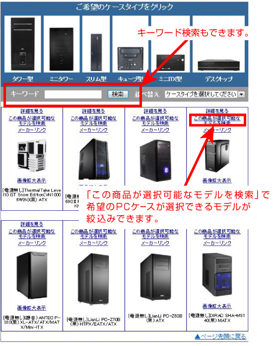 どこのショプでもそれなりに選択肢はあるが、ケース一つ見ても当ショップの選択肢の多さは半端じゃない。最新のパーツを組込むことが出来る。