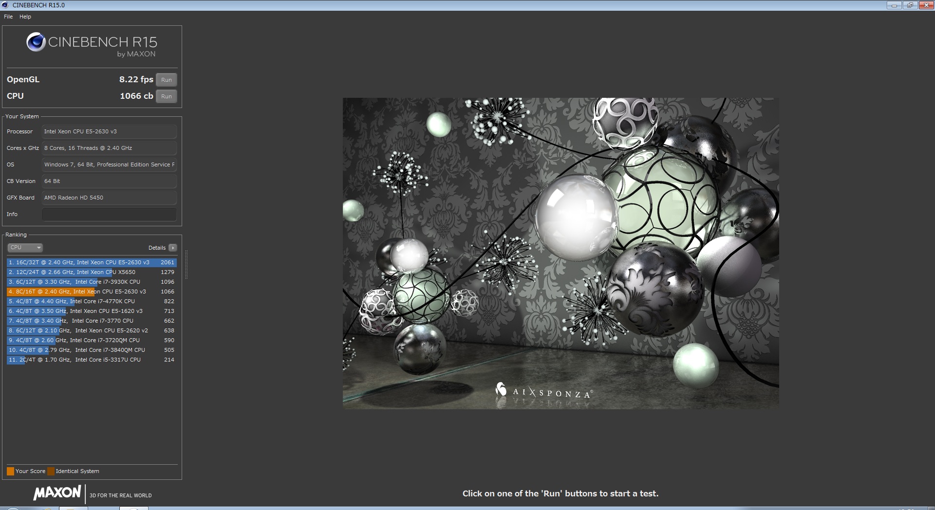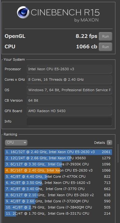 CINEBENCH R15 の結果は、CPU 1066cbでした!
