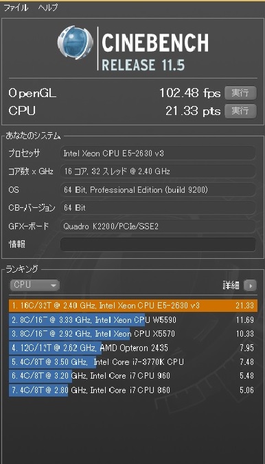 グラボはQuadro K2200 で、OpenGL 120.80fpsでした。