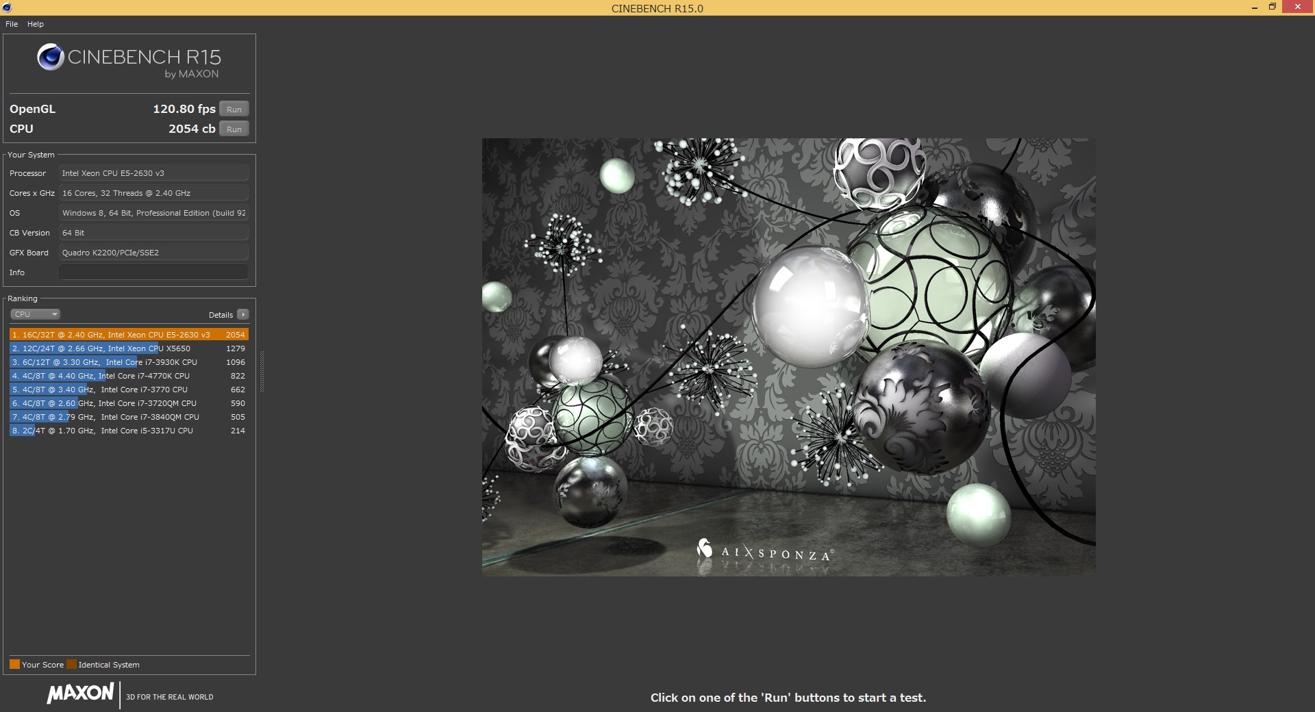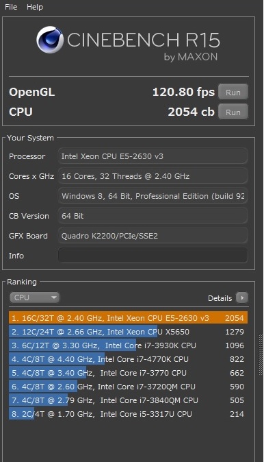 CINEBENCH R15 の結果は、CPU 2054cbでした!