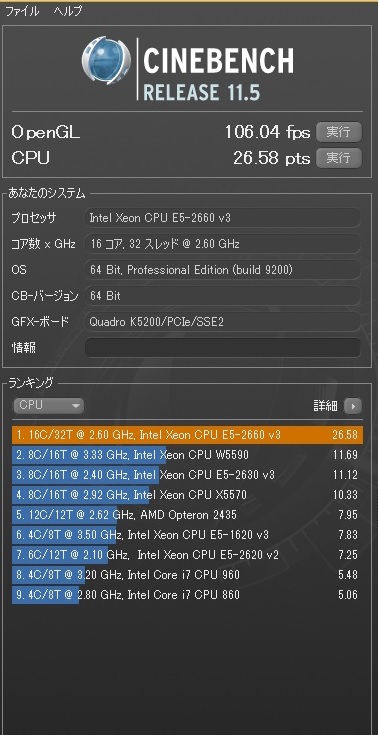 グラボはQuadro K5200 で、OpenGL 168.57fpsでした。