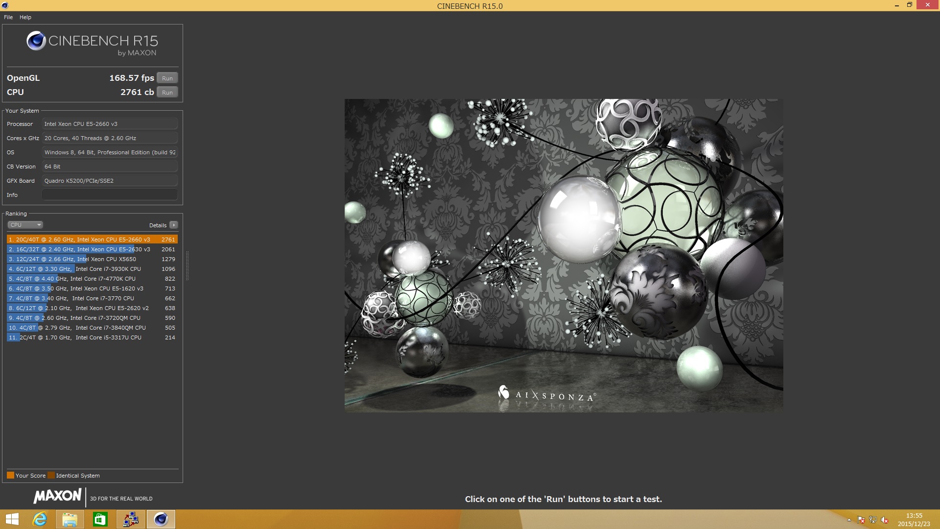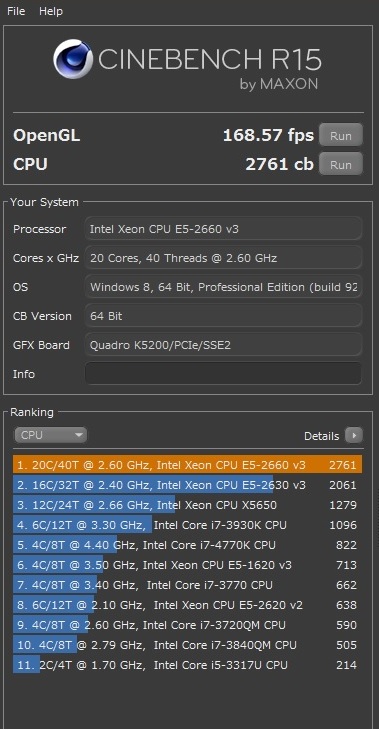 CINEBENCH R15 の結果は、CPU 2761cbでした!
